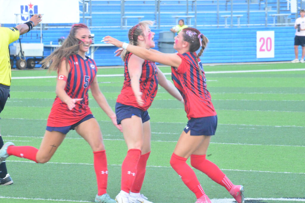 Photo: Grapevine’s Maddison Patton (middle) celebrates her second goal of the game vs Montgomery Lake Creek in the 5A D2